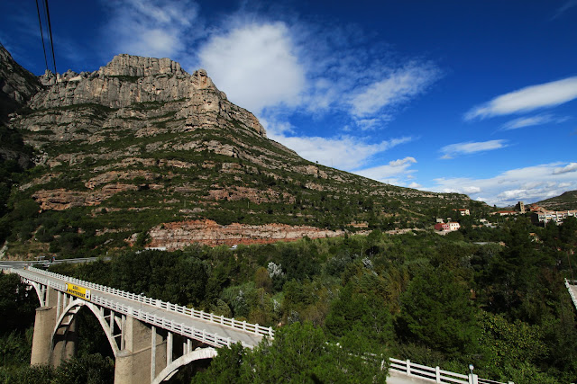 早上,坐地鐵到Espanya站(Plaça de Espanya是FGC大站),轉乘FGC(Ferrocarrils de la Generalitat de Catalunya)R5線前往Montserrat,車程約1小時,在Aeri de Montserrat站下車,再搭乘有點恐怖的纜車上山,FGC+纜車的來回套票一張16歐,在Espanya地鐵站的機器上就可以購買了。