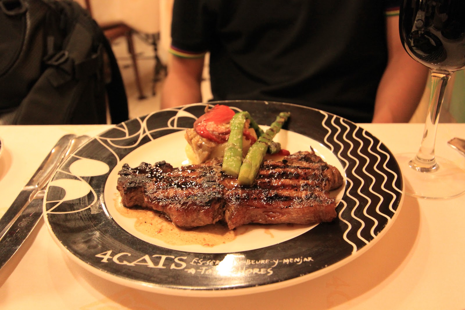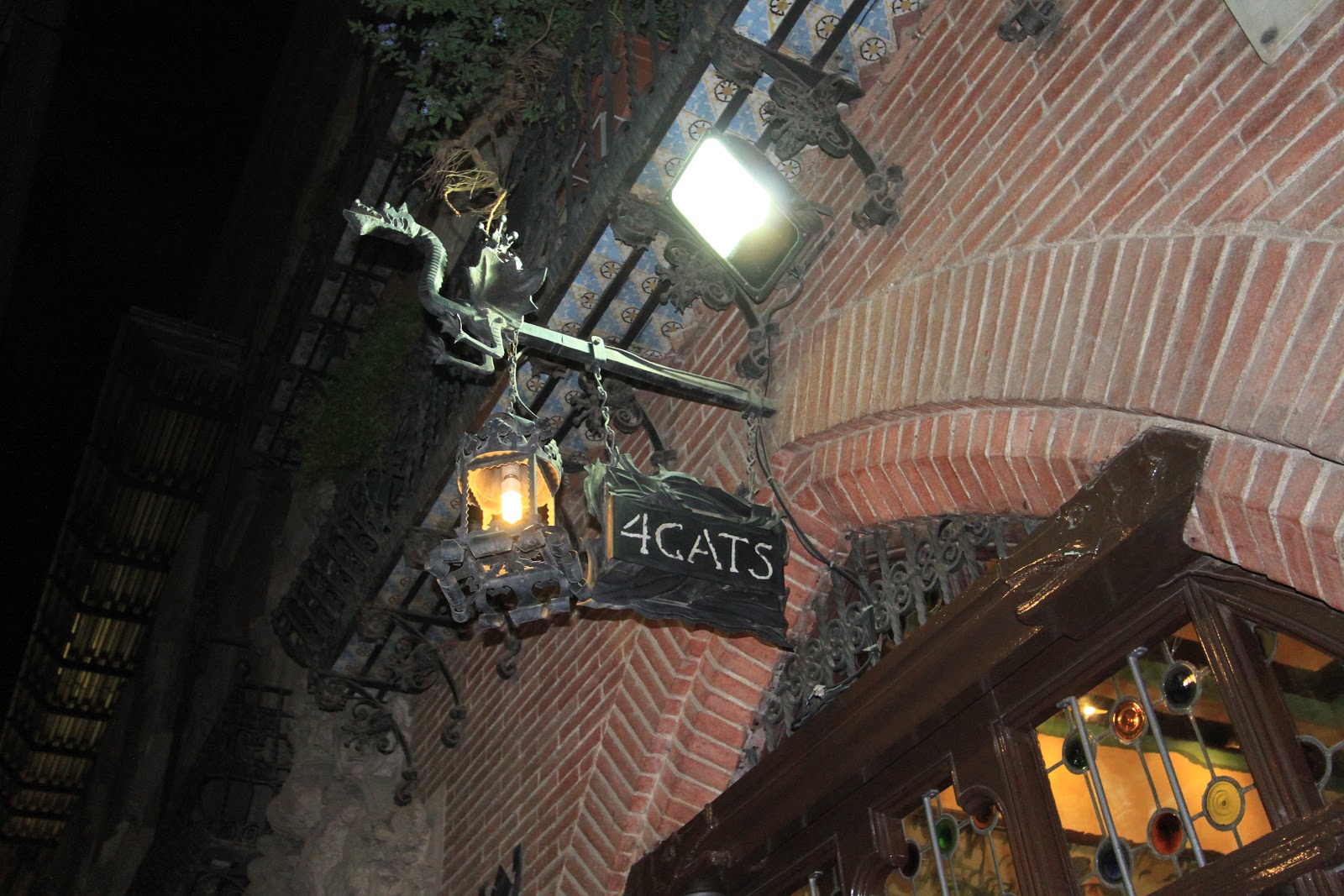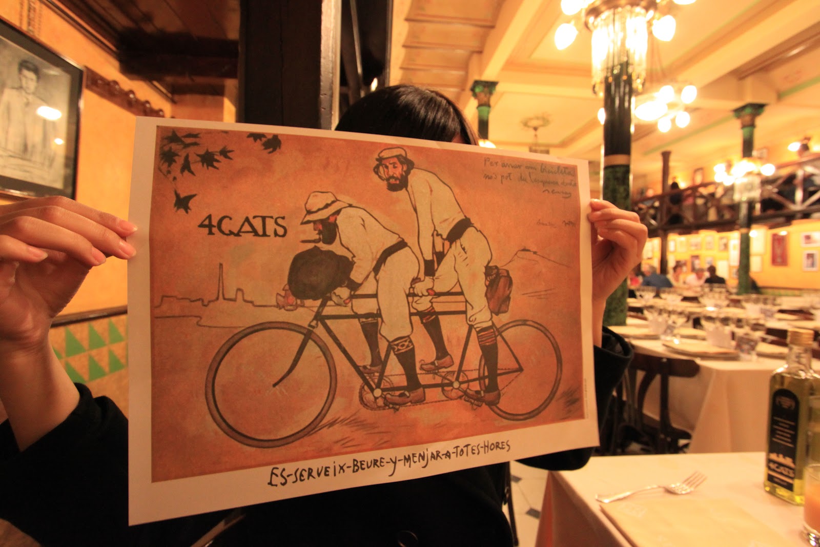 我們去有名的4 Gats吃晚餐,餐廳在用餐時段座無虛席,價錢也不便宜,我們點了牛排、豬臉頰海陸雙拼、燉魚+馬鈴薯。二十世紀初,4CATS經常聚集崇尚自由的波西米亞人與文人雅士,包括著名的畢卡索、達利、米羅、高第、羅卡等人,被稱作"四隻貓團體"。這些文人雅士所留下的草稿及塗鴉更成為咖啡館最重要的資產。餐廳使用的盤子、瓶子等器皿都有4 Gats的商標,畢卡索年輕時經常流連於4CATS咖啡館,更為咖啡館設計了第一份菜單封面,並沿用至今。