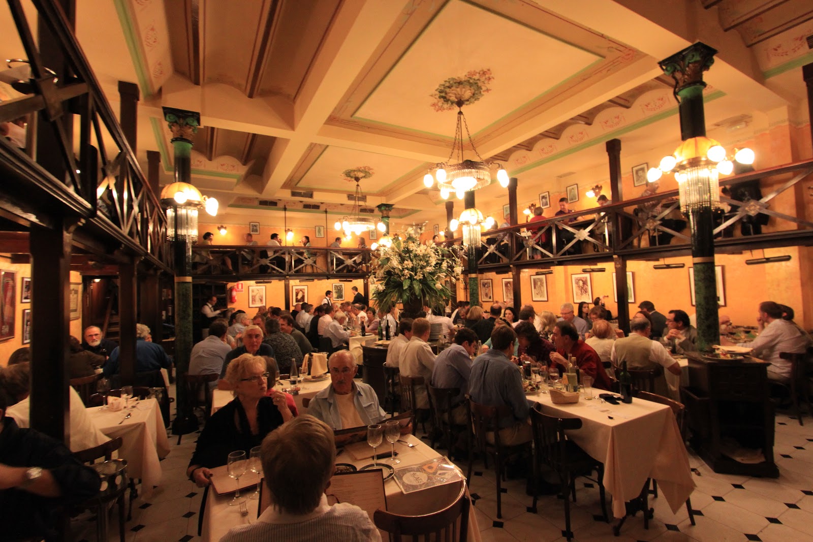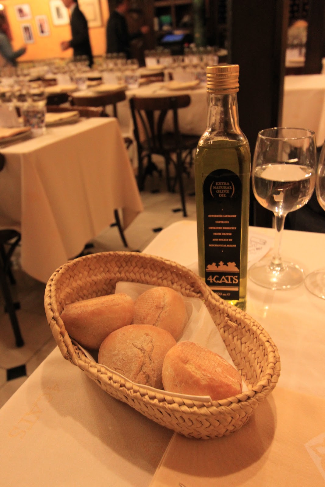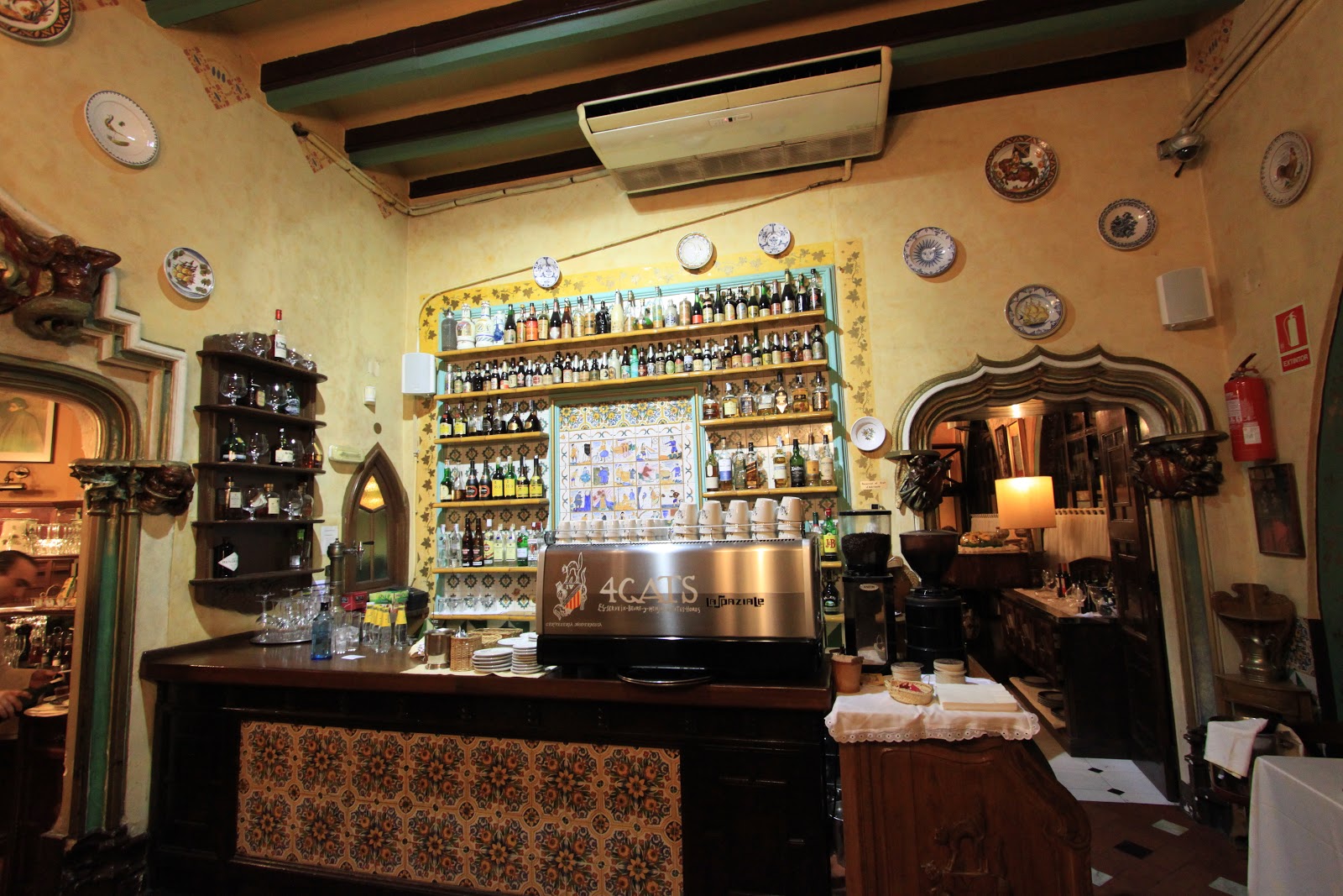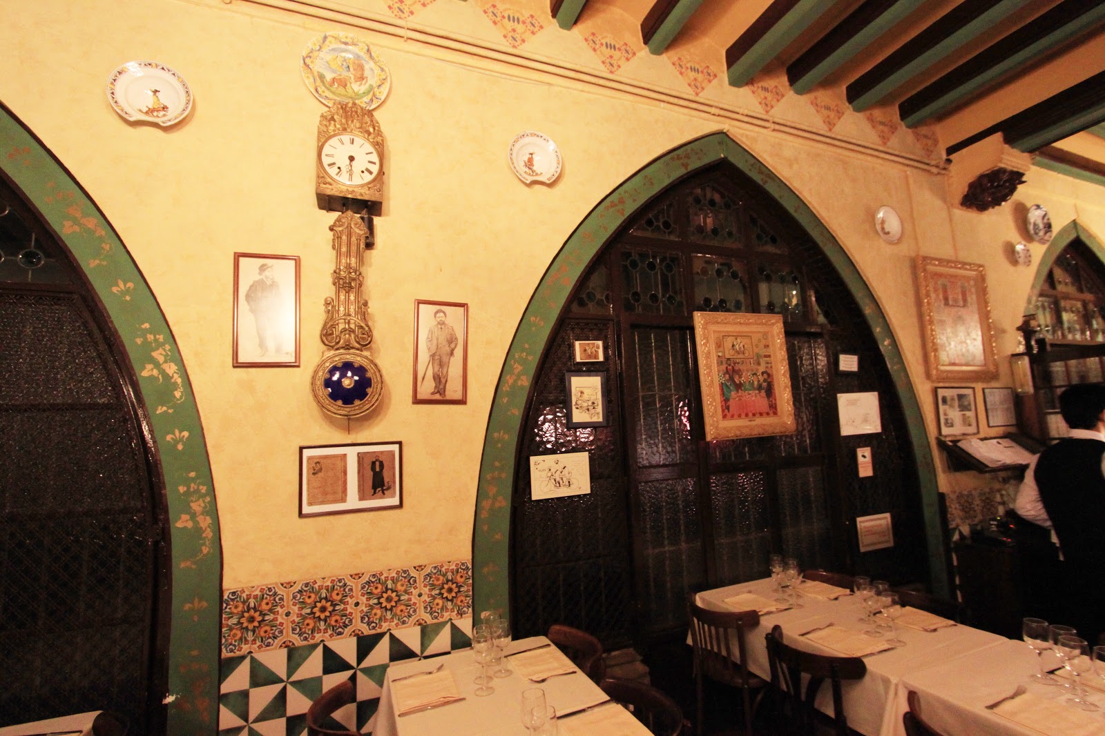 我們去有名的4 Gats吃晚餐,餐廳在用餐時段座無虛席,價錢也不便宜,我們點了牛排、豬臉頰海陸雙拼、燉魚+馬鈴薯。二十世紀初,4CATS經常聚集崇尚自由的波西米亞人與文人雅士,包括著名的畢卡索、達利、米羅、高第、羅卡等人,被稱作"四隻貓團體"。這些文人雅士所留下的草稿及塗鴉更成為咖啡館最重要的資產。餐廳使用的盤子、瓶子等器皿都有4 Gats的商標,畢卡索年輕時經常流連於4CATS咖啡館,更為咖啡館設計了第一份菜單封面,並沿用至今。