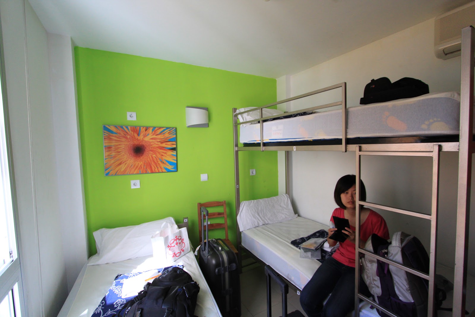 進到了房間,發現還真不是普通的小,房間內有一張單人床、一個上下舖、三個空櫃,除此之外,沒了! 行李箱要是擺在走道上,房間就沒活動空間了,窗戶還沒辦法鎖,想起前兩天在瓦倫西亞住的四星級飯店,真是天差地遠啊!!
